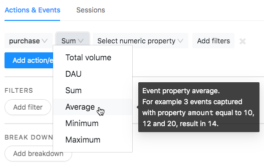 Want to know the average revenue per user? Want to know the lowest browser version anyone is using? You can now do Sum, Max, Min and Avg calculations on any event property and graph them in trends!